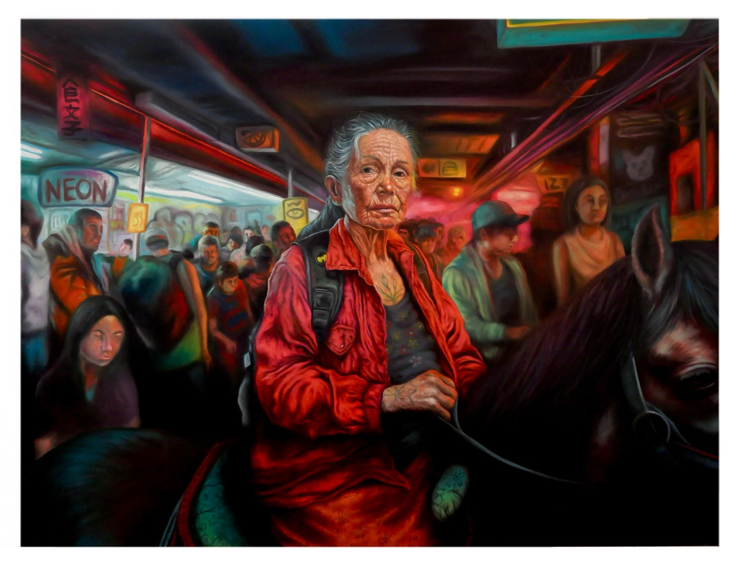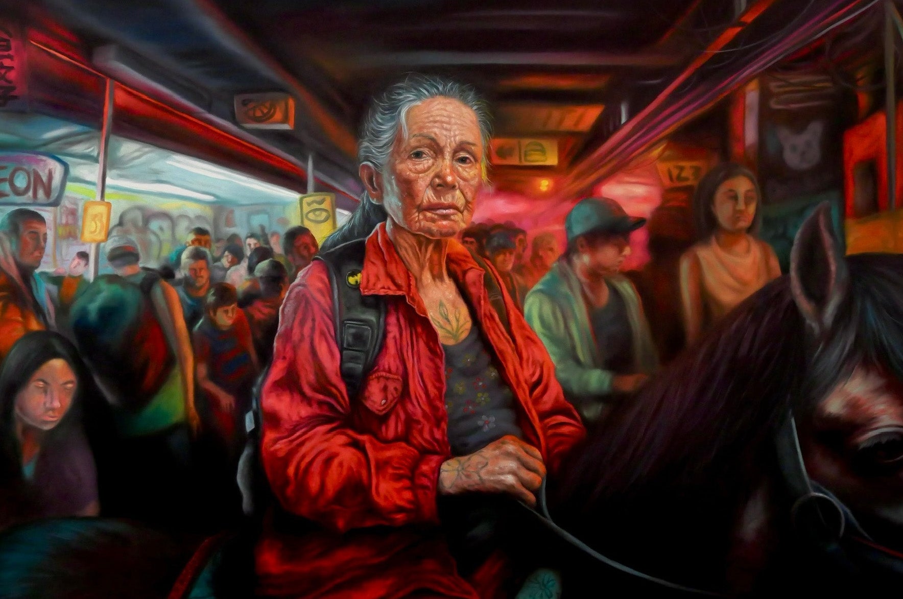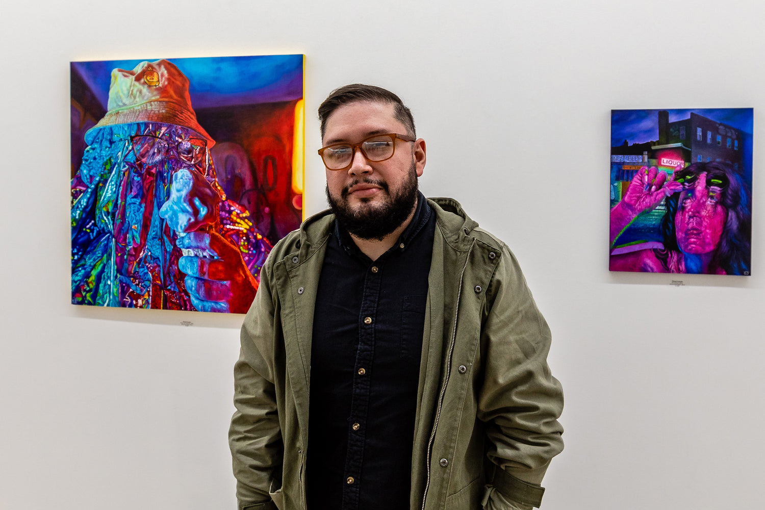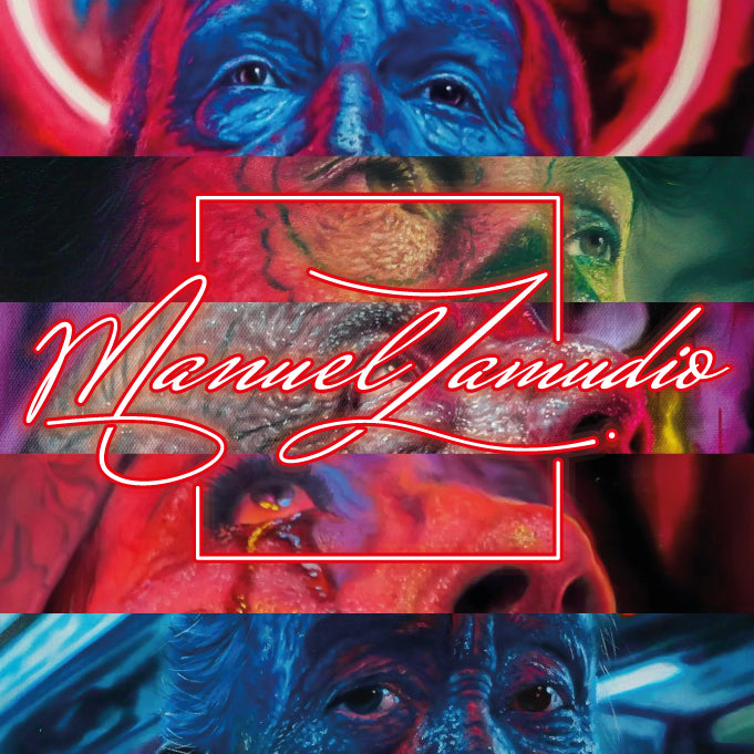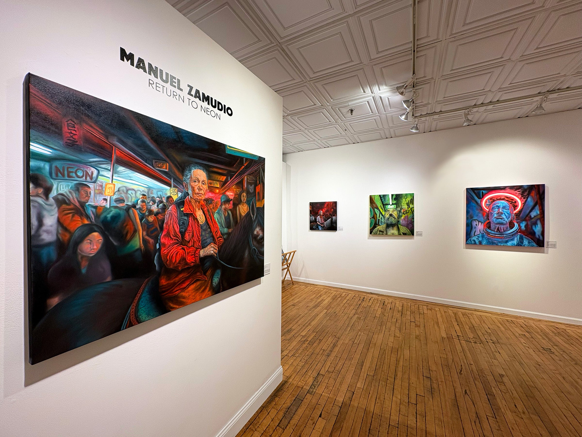 Manuel Zamudio is a Mexico City born, Texas based painter whose work bridges the visionary language of New Contemporary art with cinematic realism and dystopian mythology. Working primarily in oil, Zamudio constructs vivid portraits and neon lit worlds that explore the tension between technology, spirituality, and the endurance of the human spirit.