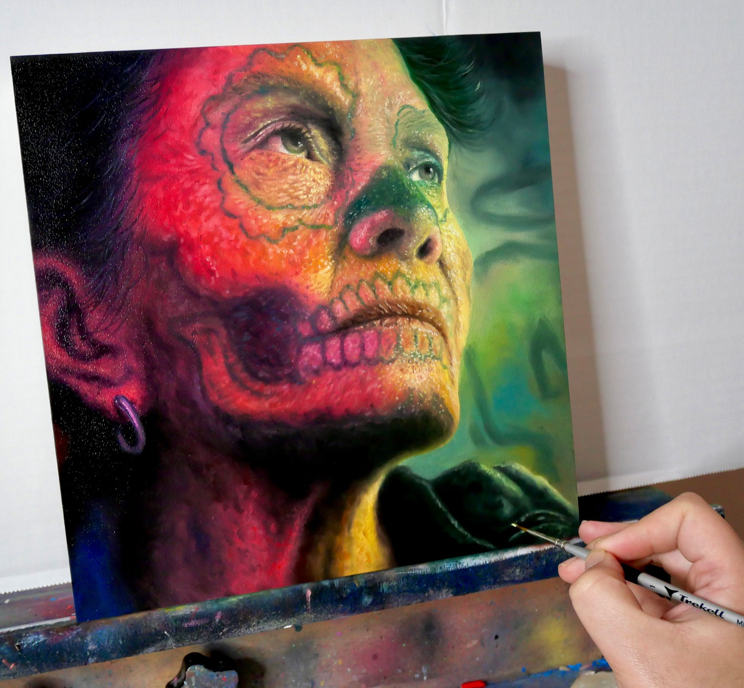 Manuel Zamudio is a Mexico City born, Texas based painter whose work bridges the visionary language of New Contemporary art with cinematic realism and dystopian mythology. Working primarily in oil, Zamudio constructs vivid portraits and neon lit worlds that explore the tension between technology, spirituality, and the endurance of the human spirit.